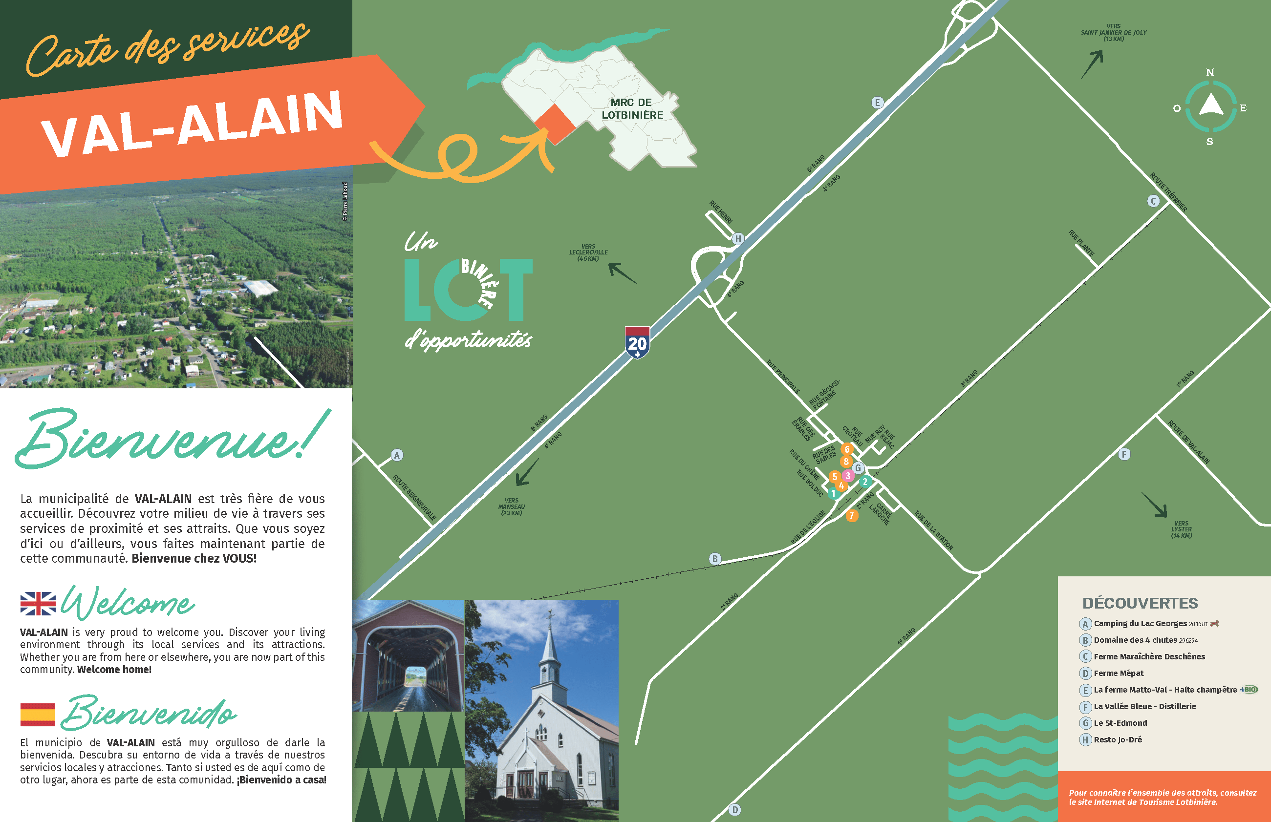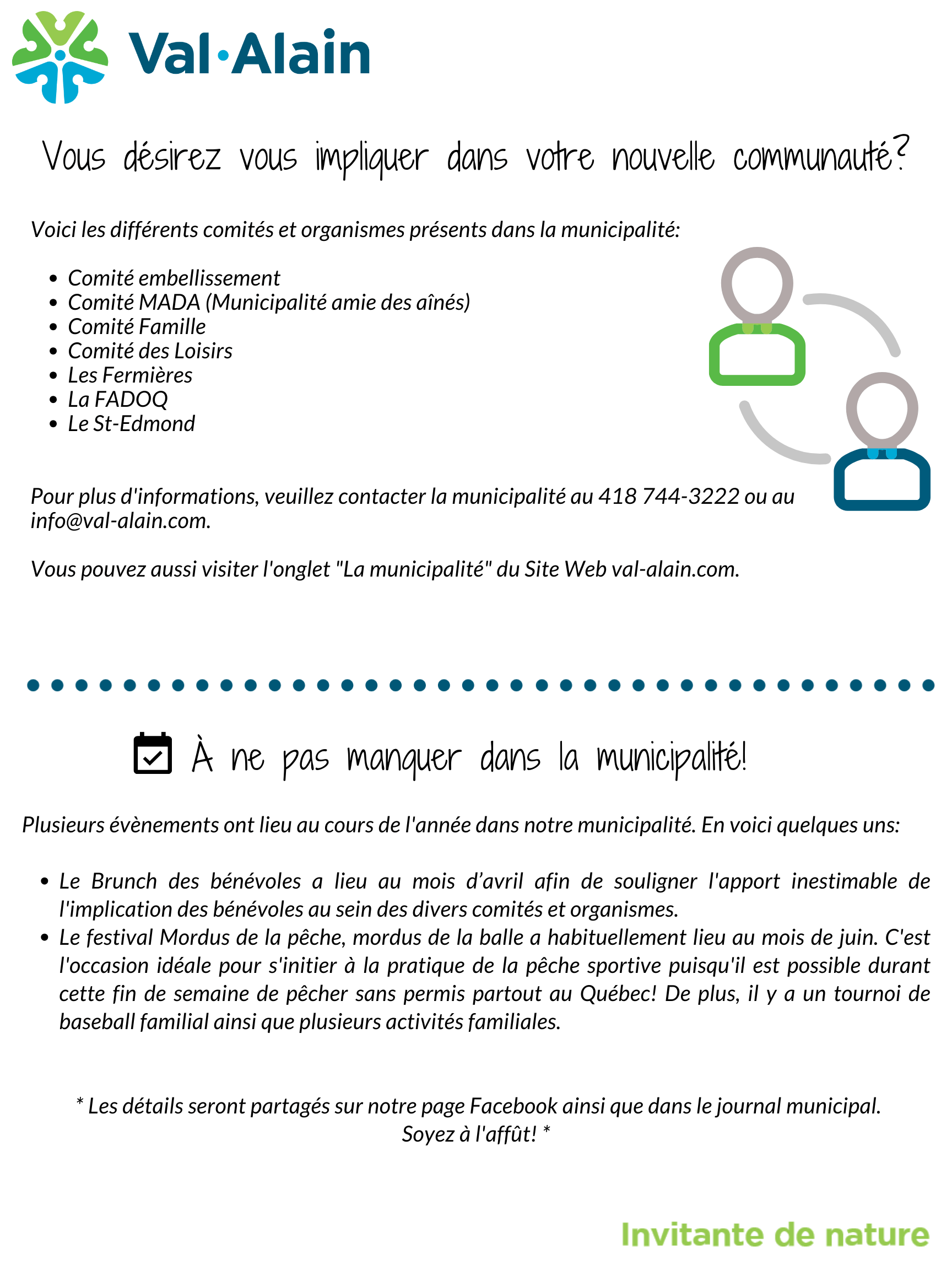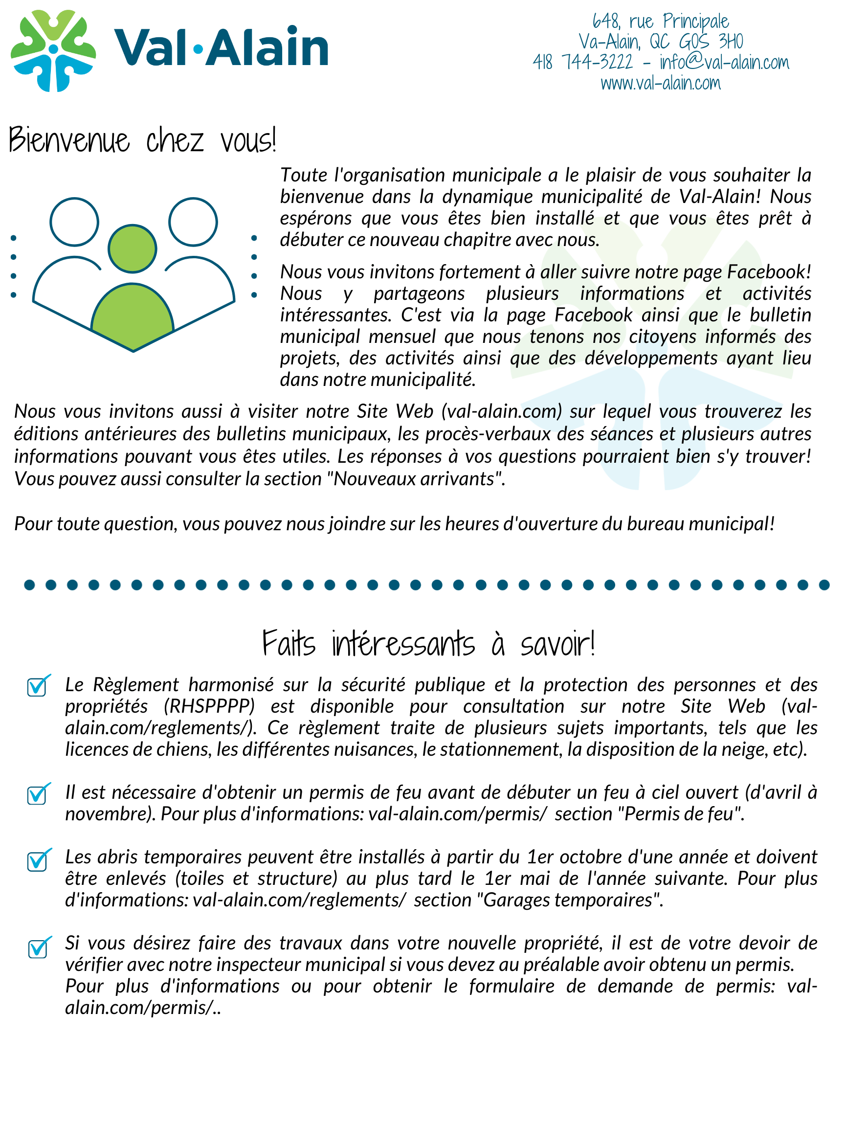 La municipalité de Val-Alain est très fière de vous accueillir dans sa communauté. Pour vous accompagner dans votre intégration, voici différentes propositions :