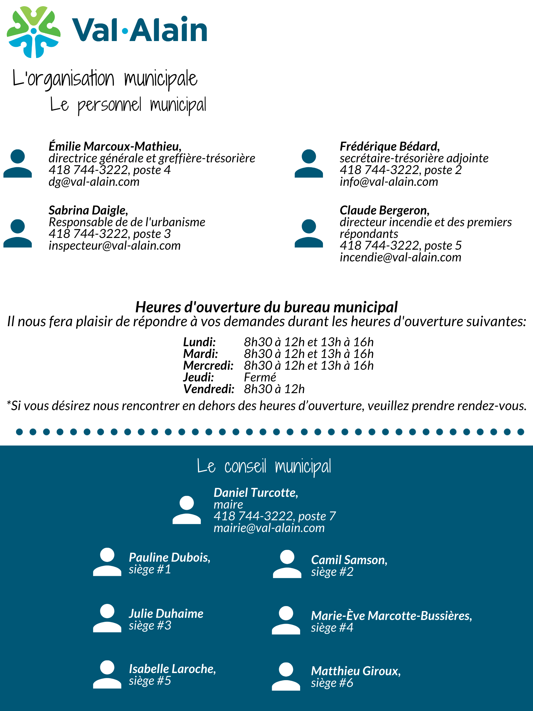- Communiquez avec votre bureau municipal afin de connaître tous nos services de proximité disponibles à Val-Alain. 648, rue Principale, Val-Alain, QC G0S 3H0